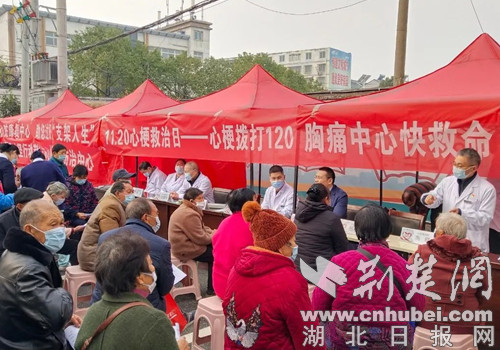 荆楚网(湖北日报网)讯(通讯员 张华)“每年的11月20日是‘心梗救治日’,就是希望大家牢记心梗救治的两个‘120’:及时拨打120急救电话、把握黄金救治120分钟,疏通阻塞的冠状动脉,让心脏重获血供……”11月19日,荆门二医医务科科长涂敏的“科普”,拉开了东宝区石桥驿镇卫生院“心梗救治日”义诊宣教的序幕。