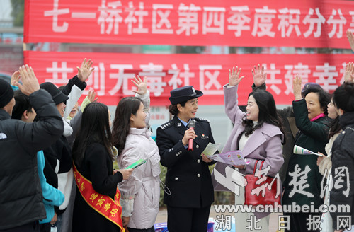 荆楚网(湖北日报网)讯(通讯员 刘柳)“人人参与禁毒宣传,人人争当禁毒志愿者”。12月8日,荆门市公安局高新区·掇刀区分局白庙派出所联合白庙街道中心戒毒社区和七一桥社区开展禁毒宣传活动。