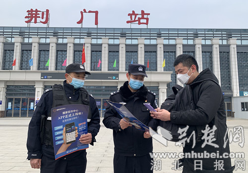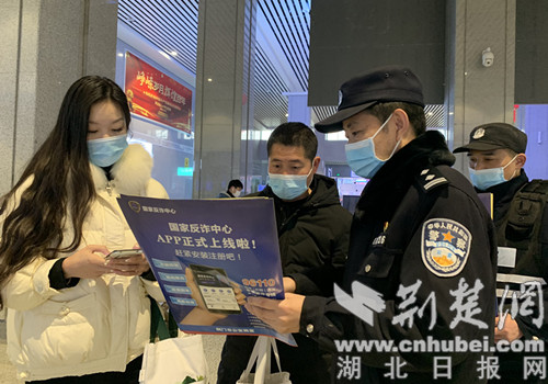 荆楚网(湖北日报网)讯(通讯员 陈晨)虎年春节小长假刚刚结束,荆门火车站迎来了人员外出复工高峰,为防范境外“高薪招聘”、“黑中介”、虚假小广告等招工诈骗案件的发生,2月8日上午,荆门市公安局东宝分局泉口派出所民辅警在荆门火车站开展预防电信网络诈骗知识宣传。