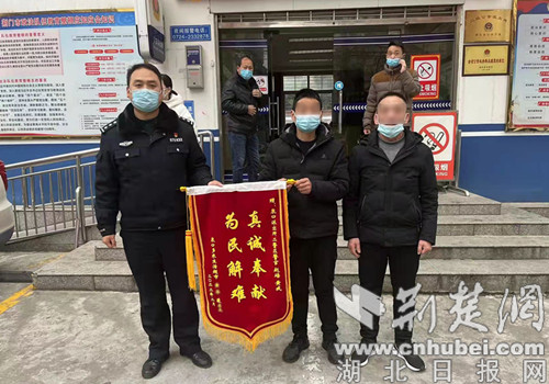 荆楚网(湖北日报网)讯(通讯员 赵培)“感谢你们的热心服务,年前帮我找回了丢失的挎包,解了燃眉之急。因工作原因,今天才有时间过来送锦旗表示感谢。”2月14日上午10时许,市民裴先生和泉口路多米生活超市负责人一行将一面印着“真诚奉献 为民解难”的锦旗送到民警手中,并提前祝民警元宵节快乐。