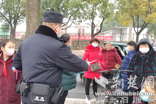 图为民警向学生家长发放宣传资料。通讯员供图
