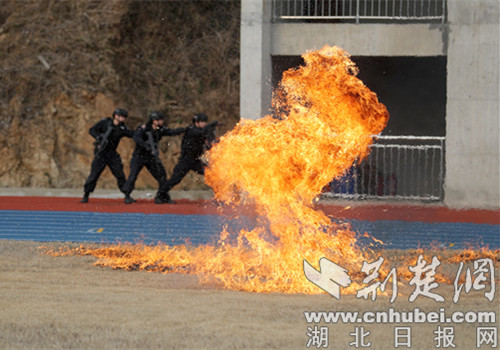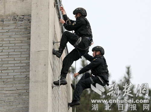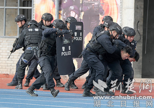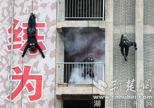 荆楚网(湖北日报网)讯(通讯员 贺林辉)2月22日,在湖北荆门反恐实战演练中,荆门市公安局巡特警支队“荆鹰”特战小分队队员荷枪实弹展开强攻,仅用10秒就将嫌犯控制。此次演练紧张有序,各环节配合紧密,全体参演人员以高昂的士气、饱满的精神面貌、娴熟的动作和精湛的技能赢得现场观摩人员一致好评。连日来,湖北省荆门市公安局着眼警务实战,组织特战队员开展高楼速降、突击处突、战术射击等多科目综合训练,以进一步提高特战队员攻坚突击、反恐处置、快速反应的作战能力。