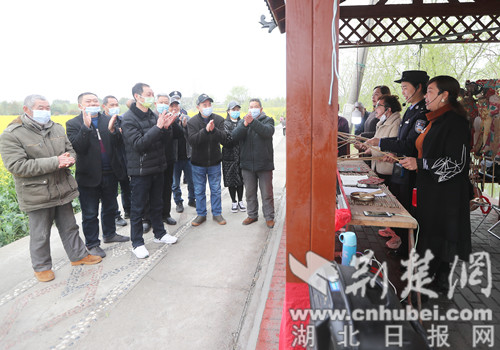 荆楚网(湖北日报网)讯(通讯员 黄翔)“毒品不能沾,家和人也安……”3月26日,湖北省沙洋县曾集镇张池农耕文化体验园内油菜花海风光秀美游人如织,非物质文化遗产孙店皮影戏传承人与沙洋县公安局民警共同演绎一场禁毒主题剧目,游客纷纷驻足观看。