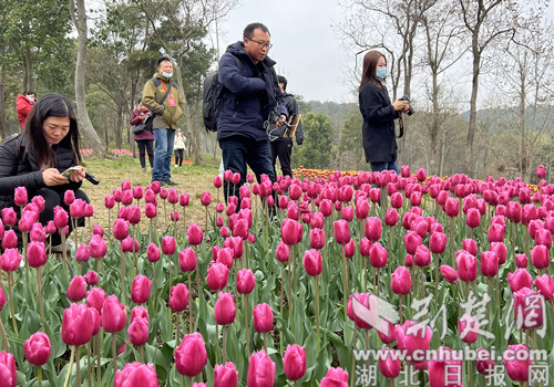 “快来这里拍照!这红得似火的郁金香真好看!”3月24日,记者在景区看到,在和煦阳光的照耀下,姹紫嫣红的郁金香花开如玉杯,亭亭绽放,花朵娇艳动人,惹人喜爱,不少游客徜徉在郁金香花海中赏花拍照。该景区运营总监何乾成说,近期景区举办了第四届郁金香节,20万株郁金香已全部盛放,迎接八方游客。