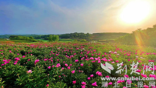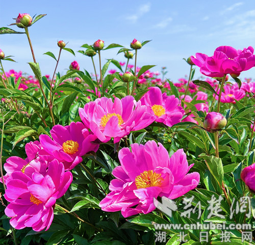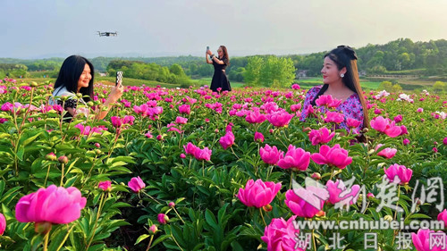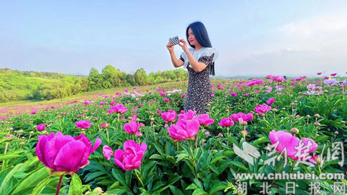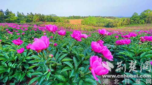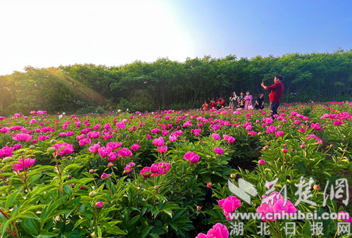 荆楚网(湖北日报网)讯(通讯员 欧阳露萍)4月19日,在荆门市东宝区仙居乡黑峪村芍药种植基地,千亩芍药花海迎风怒放。前来旅游观光的游客络绎不绝。蓝天、花海、构成一幅大自然的绝美画卷,让游客如痴如醉。