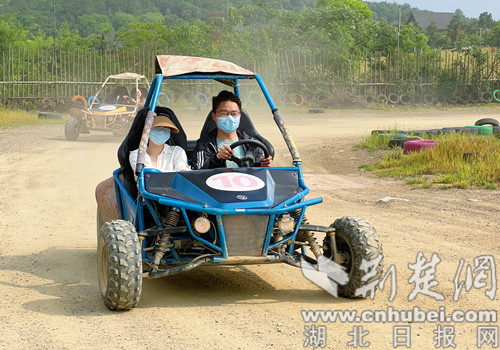 图为媒体记者在圣境花谷体验卡丁车。安从斌摄