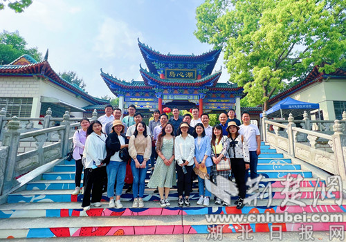 参加采访行的媒体记者在漳河湖心岛景区合影留念。安从斌摄