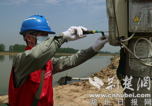 荆楚网(湖北日报网)讯(通讯员 张苹)眼下正值农业灌溉用电高峰期,在荆门市沙洋县沙洋镇友谊村六组田间,抽水机发出“隆隆”声响,一股股清澈水流沿着管道缓缓注入水田。田地一旁,县供电公司汉津供电所的党员志愿者正在为养殖户董长清检查临时电表。“现在用电主要是稻田、虾田的抽水排灌。特别是虾田,气温越高,对水更新速度要求就越高。需要多换水,龙虾生长肉质才会更好。”董长清笑着说。