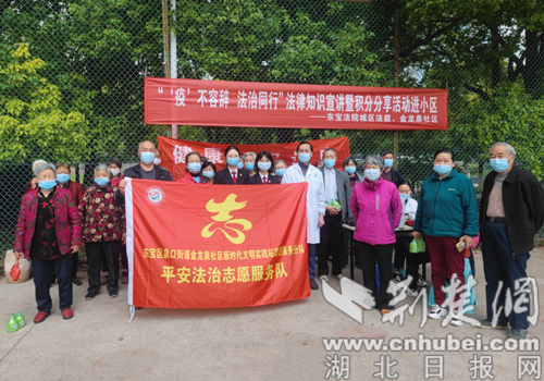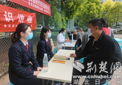 荆楚网(湖北日报网)讯(通讯员 靳凯)4月29日下午,荆门市东宝区泉口街道金龙泉社区联合大党委成员单位东宝区法院城区法庭、社区卫生服务站,走进物业小区北辰花苑院内开展“‘疫’不容辞 法治同行”卫生健康知识和法律知识宣传志愿服务暨积分奖励活动。