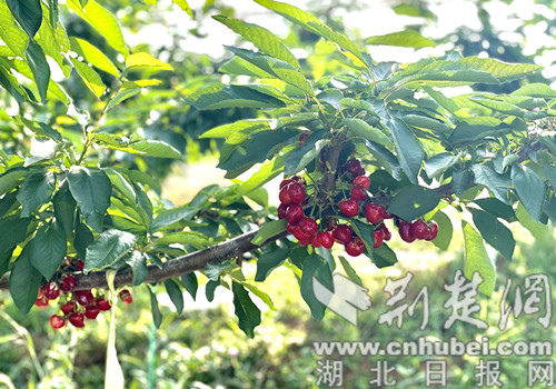 荆楚网(湖北日报网)讯(通讯员 周雅洁)5月12日,在京山市钱场镇刘岭村车厘子基地大棚内,一簇簇车厘子颗粒饱满,鲜红欲滴,与绿色的枝叶交相辉映。
