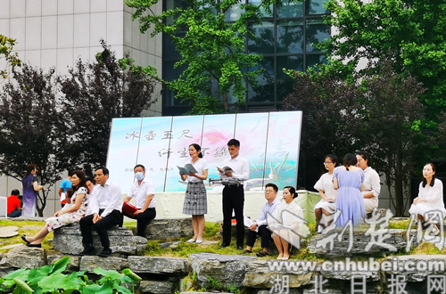 “菊,花之隐逸者也;牡丹,花之富贵者也,唯莲花“出淤泥而不染,濯清涟而不妖……”读书会以北宋理学家周敦颐的散文《爱莲说》为开篇,在古筝的伴奏下,两位小朋友稚嫩的声音却将爱莲说朗诵地铿锵有力,声音在池畔回响,引来阵阵掌声。