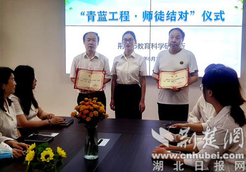 结对仪式上,张志勇宣读了“青蓝工程”师徒结对名单,荆门市教科所党支部书记、所长赵杏芳向受聘师傅——正高级教师王清卫、特级教师左昌伦颁发了聘书,结对教师向两位师傅鞠躬行谢师礼并献上鲜花。