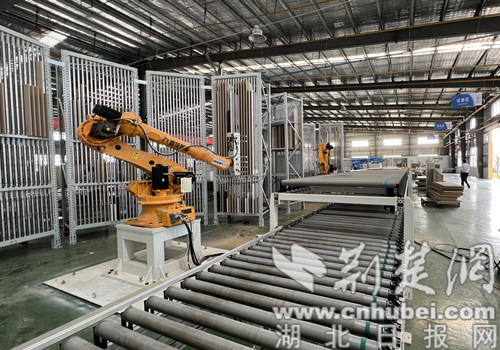 当天下午,采访团第一站来到万华禾香板业(荆门)有限责任有限公司。车间内迎面而来的是一阵禾香气息,伴随着机器的轰鸣,一簇簇秸秆经过干燥、粉碎、热压等12道工序,神奇地“变身”成为生态环保的新型板材。“最大的特点就是零甲醛,我们和欧派、索菲亚等知名品牌都有合作,市场销售供不应求……”万华禾香板业(荆门)有限责任公司董事长杨志坚说。如果说秸秆代木是变废为宝的“魔术”,那么5G智慧工厂就是科技加持下的工业表演。在伊恋全屋定制华中智造中心,四条工业4.0全自动智能化定制家具生产线正全速运转。该公司借助5G技术,融合互联网、大数据与人工智能制造,打通企业各个流程,实现了从设计、生产到销售各个环节的互联互通。