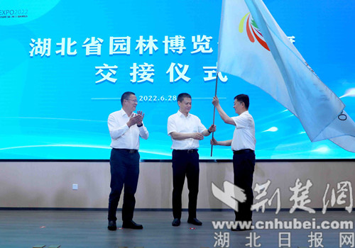 活动最后,庄光明、李涛与鄂州市政府副市长邱实进行园博会会旗交接。湖北省第四届园林博览会将在鄂州举办。