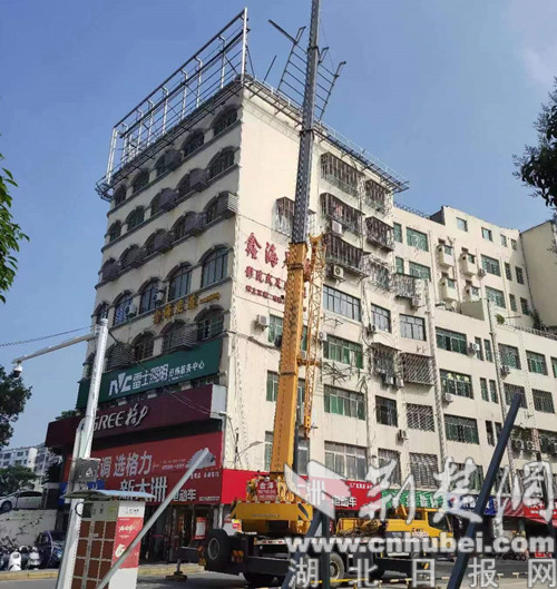 经现场勘查,该大型户外广告设置于虎牙关大道97号楼顶,已过审批期限。由于该户外广告整体为钢质结构,高度宽度超限,且绕楼顶三面设置,呈U形状,重量过重导致楼顶横梁、墙面出现裂纹,存在较大安全隐患。对此,市城管执法督察支队于6月14日督办掇刀城管执法大队、掇刀石街道综合执法中心向该广告所属单位及房屋所有人等相关当事人下达《限期拆除通知书》,责令其在7日内自行拆除。