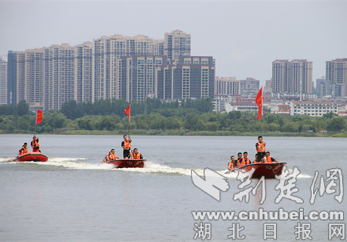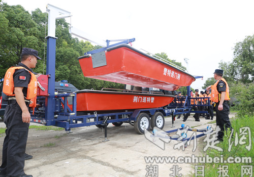 荆楚网(湖北日报网)讯(记者 安从斌 通讯员 贺林辉)7月6日,荆门市公安局巡特警支队举行2022年度夏季汛期应急拉动演练,此次演练以荆门市某水域受到强降雨影响,水面暴涨、人员被困为背景,依托凤凰湖水域模拟实战环境。