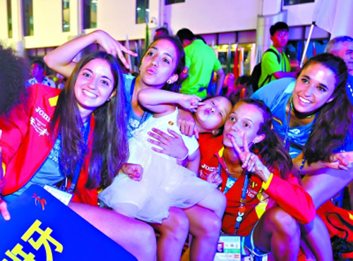 随后,中学生们分了两队,分别来到了武汉三中和武汉市第二十三中学。在武汉三中的体育馆里,葡萄牙和保加利亚的中学生们跟三中学生一起玩了一场趣味运动会。在二十三中,意大利、西班牙和中国的学生们互相介绍了家乡美景、美食和风俗,还游历了晴川阁。