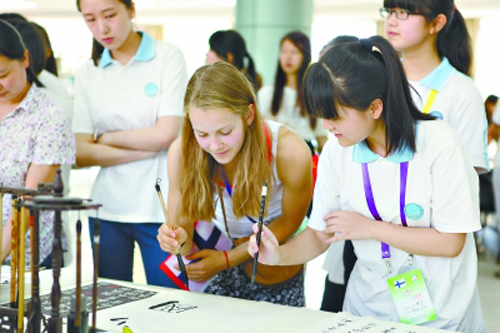 芬兰队员在钢都中学学生帮助下学写毛笔字 杨宏 摄