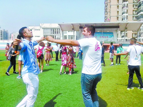 足球场上,汉铁高中新疆班的同学们已着盛装等待远客到来。新疆民族歌曲《跳起来》响起时,不仅新疆班的姑娘们跳了起来,土耳其小伙子也打着节拍,迈开步伐,跟着音乐扭动身体,一时间,外国朋友们纷纷放下书包,举起手,唱起歌一起“嗨”。新疆姑娘们也提起裙摆,与外国朋友们两两对跳。节目中途,新疆姑娘邀请外国友人上台共同表演,并教她们新疆特色舞蹈——扭脖子,大家学得有模有样。中外的中学生们来了一场即兴“斗舞”,你一个跟头,我一个空翻,谁也不输谁。汉铁高中李颖主任说,虽然他们语言交流不是很通畅,但是音乐和青春无国界。新疆姑娘艾努娃尔说:“外国朋友们很大方,大家玩起来一点都不拘束,好像认识了很久”。 (记者刘嘉 实习生张婷 通讯员徐晓芳)