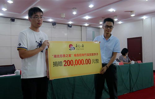 湖北手机报消息 近日,2015年喻友旺助学金--首站发放仪式在竹溪举行,虽本人未能亲临现场,其大学刚毕业的儿子喻星,在侄子喻方强的陪同将父亲捐资的20万助学金如期发放给100名贫困学子手中。