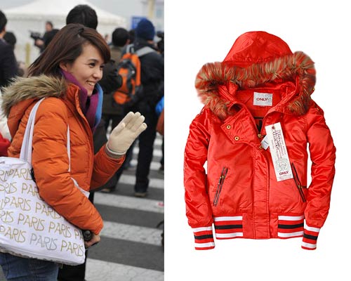 橘色羽绒服十分抢眼,在享受时尚的同时也不失保暖功效。