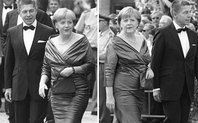 默克尔2008年出席拜罗伊特音乐节的照片(左)与当天的照片进行对比,服装几无差别。