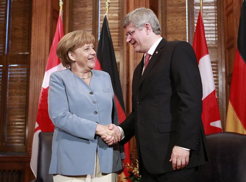 2012年8月16日,在加拿大渥太华的总理办公室,加拿大总理哈珀(右)与德国总理默克尔握手。正在加拿大访问的德国总理默克尔16日说,德国支持加拿大与欧盟加快就签署一份“全面经济贸易协定”的谈判进程。图片:新华社发(摄影:布莱尔·盖布尔)