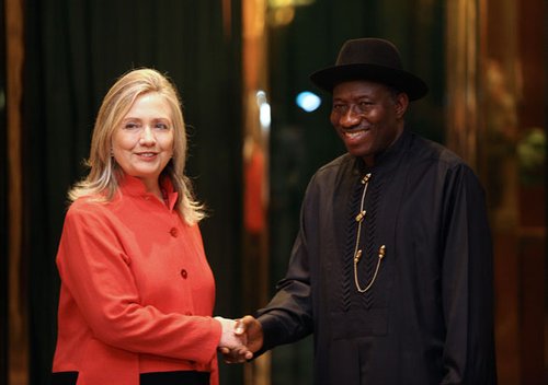 2012年8月9日,在尼日利亚首都阿布贾,美国国务卿希拉里·克林顿(左)同尼日利亚总统古德勒克·乔纳森握手。希拉里·克林顿当天下午抵达阿布贾,并与尼日利亚总统乔纳森进行了长达2个半小时的会谈。图片:新华社/法新