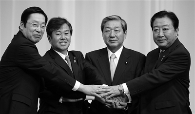 10日,野田佳彦、赤松广隆、原口一博与鹿野道彦(从右至左)出席记者会。新华社发