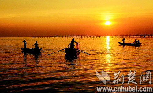 图为:渔舟唱晚。一抹晚霞洒在梁子湖波光粼粼的湖面上,渔民收网而归。