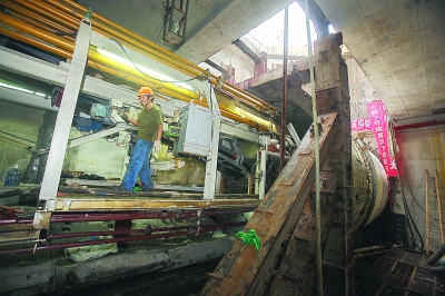 昨日,地铁3号线中央商务区站,盾构机开始盾构施工,开足马力向地下掘进。记者 陈卓 摄