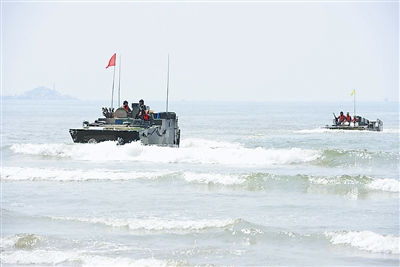 两栖装甲战车抢滩登陆。两栖装甲战车抢滩登陆 图片来源:解放军报