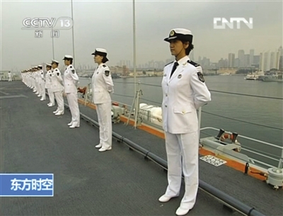 女性舰员在辽宁舰上站坡。据该舰政委介绍,辽宁舰上配备了将近5%的女性舰员。央视截图