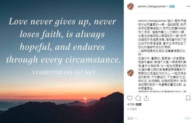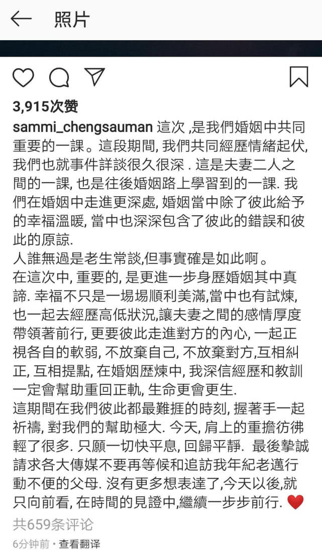 这期间在我们彼此都最难捱的时刻,握着手一起祈祷,对我们的帮助极大。今天,肩上的重担彷彿轻了很多。只愿一切快平息,回归平静。最后挚诚请求各大传媒不要再等候和追访我年纪老迈行动不便的父母,没有更多想表达了,今天以后,就只向前看,在时间的见证中,继续一步步前行。
