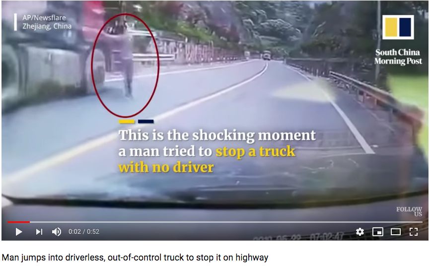 千钧一发之际,一名男子身手矫健地飞身上车,刹停了失控卡车。