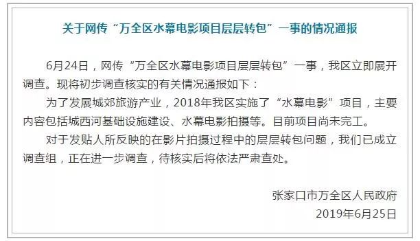 “万全区水幕电影项目层层转包”一事24日起在网上流传。记者获悉,25日,当地已成立调查组,“待核实后将依法严肃查处”。