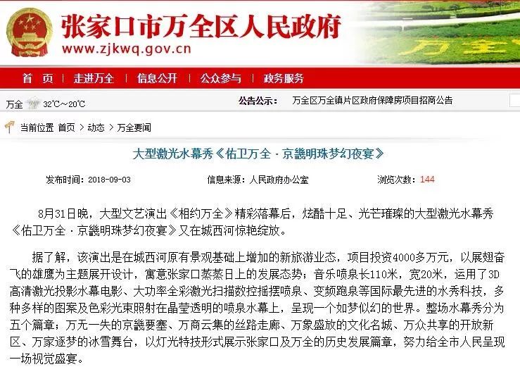 对此,张家口市万全区人民政府25日通报,为了发展城郊旅游产业,2018年我区实施了“水幕电影”项目,主要内容包括城西河基础设施建设、水幕电影拍摄等。目前项目尚未完工。