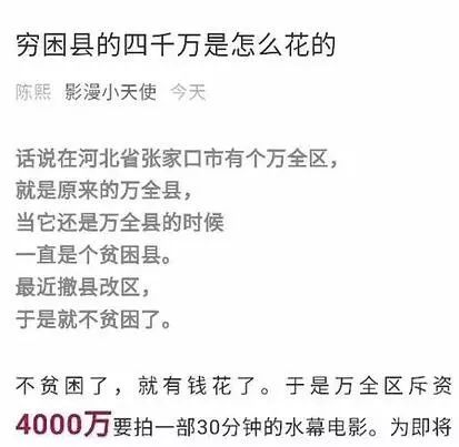 《穷困县的四千万是怎么花的》一文称,张家口市万全区斥资4000万拍摄一部30分钟的水幕电影。项目经层层外包,最终由导演陈熙落实拍摄。