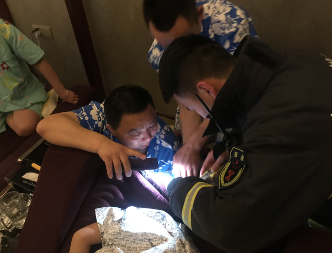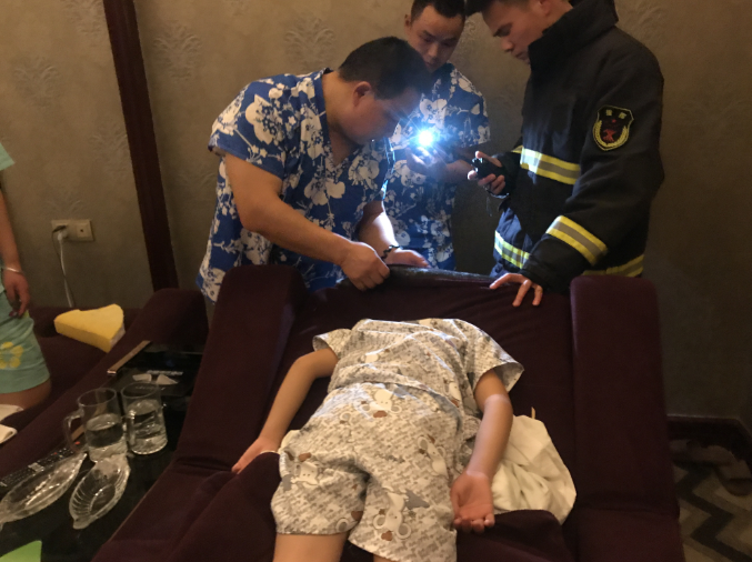 2月15日凌晨,湖北襄阳市东风路一汗蒸会所三楼休息包间内,一熊孩子贪玩,将头钻进木质的躺卧沙发洞里被卡住出不来,店内工作人员和孩子父母在尝试多种方法自救无果后报警求助消防。