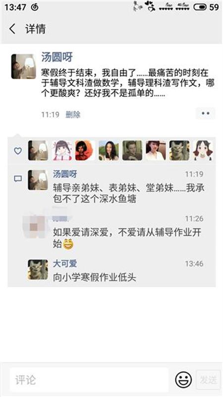楚天都市报2月27日讯(记者王进良 通讯员雷蕾 刘丽媛 李锦)“寒假终于结束,我自由了……最痛苦的时刻在于辅导文科渣做数学,辅导理科渣写作文,哪个更酸爽?还好我不是孤单的……”武昌工学院会计学院大一学生杜佳琪的这条朋友圈,引来同学们共鸣,不少大学生表示摆脱“家教辅导员”这个身份,令人神清气爽。