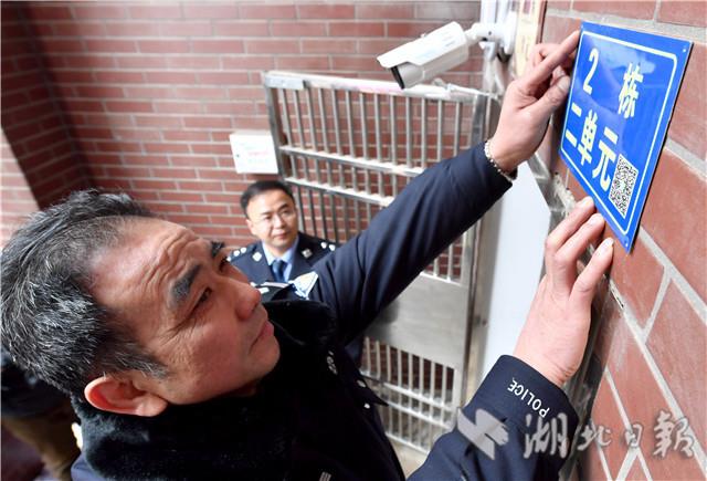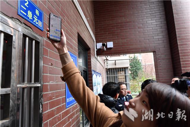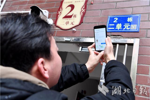 3月1日,武汉市东湖高新区九峰街清河里社区2栋二单元,居民扫码新式二维码智慧门牌。当天起,武汉警方率先启动二维码门牌安装工作。