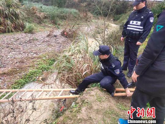 见被困人员暂时较为安全,朱智侠一方面观察现场情况,另一方面根据实际情况调整救援方案,并果断安排辅警迅速赶赴村里借来爬梯,并从两岸最近的亮点位把爬梯架过去。