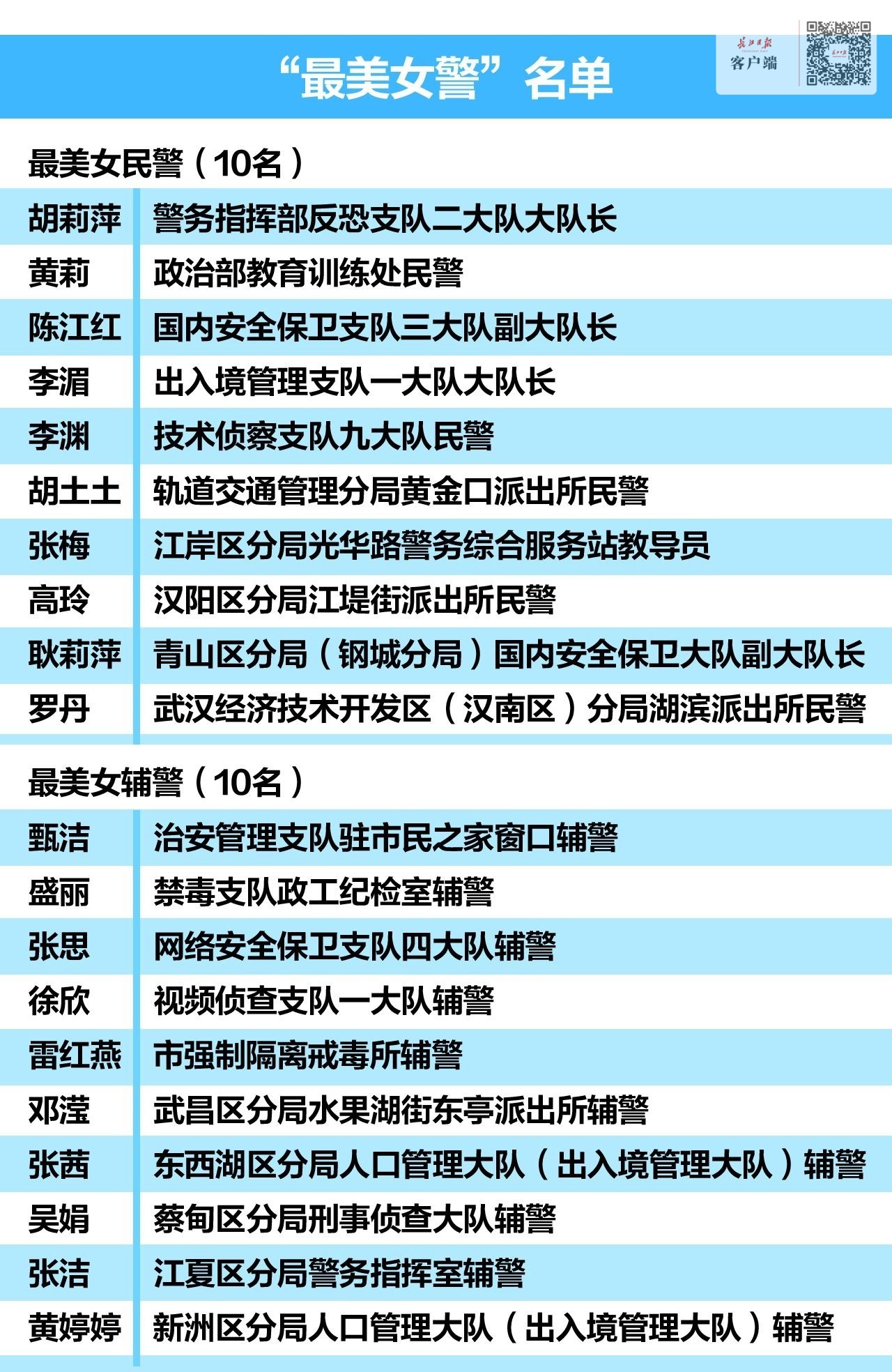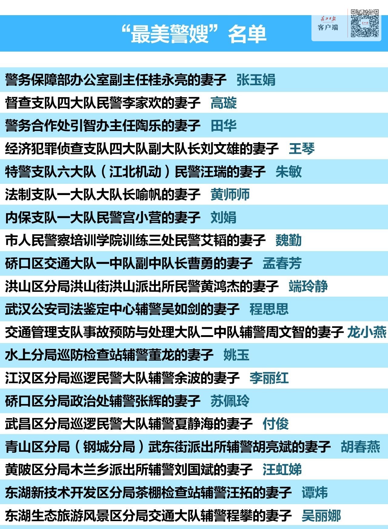 长江日报融媒体3月6日讯3月6日,2018年度武汉“最美女警”“最美警嫂”名单揭晓。20名女民警、女辅警获“最美女警”荣誉称号;10名民警的妻子、10名辅警的妻子获“最美警嫂”荣誉称号。据悉,这是武汉市公安局首次对辅警的妻子给予表彰。