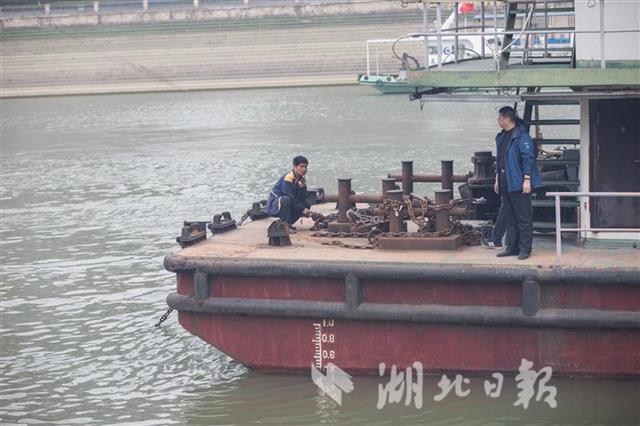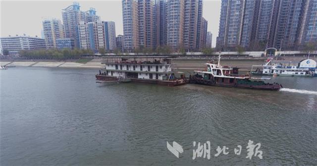 上午9时许,鄂黄冈0999拖轮开始启动,将中科院水生所两艘船缓缓拖向上游,穿过月湖桥,半小时后,拖至月湖桥上游350米处的汉江江滩边安营扎寨。