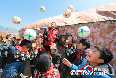 哈甘基点小学的孩子们玩起志愿服务队赠送的足球