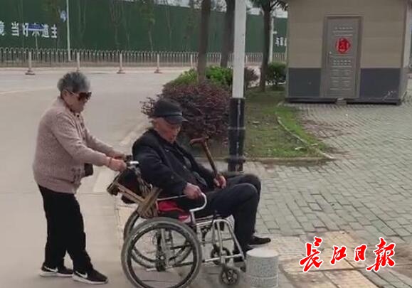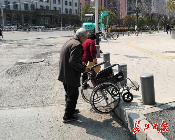 3月19日上午,在香港路建设大道路口,85岁的曹爷爷推着坐在轮椅上的老伴,从汉阳乘地铁到汉口办事。因为要过马路,曹爷爷将老伴的轮椅推到人行道边的道坎处。该处道坎高约5厘米。曹爷爷先将老伴从轮椅上扶起,待自己将轮椅从道坎上搬下后,再把老伴扶到轮椅上就坐。