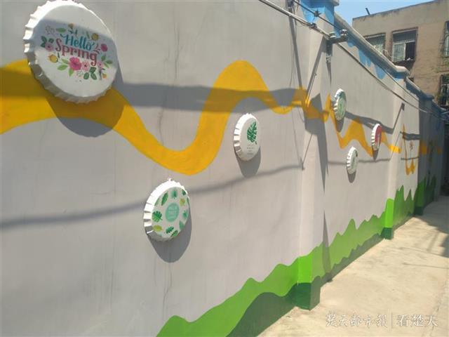 在小区花坛,亮眼的撞色涂装,映衬着生机勃勃的绿植,美观又醒目。掉渣的小区围墙,涂上底色后,安装上啤酒瓶盖,盖上作画,变身文化墙。