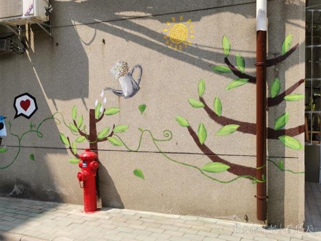 碍眼的变压器电杆,涂上灰色涂料,“种上花卉”,成为小区“景点”。墙角的下水道,经过涂装,成为画中的树干,巧妙融为一体。