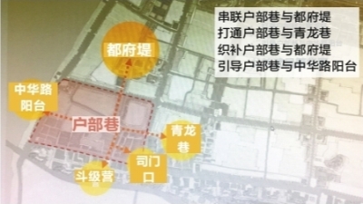 该负责人介绍,户部巷长远规划拟新增户部巷至汉阳门码头轴线,作为古城千年特色轴线的延伸,且由主轴延伸出分支巷道,由此串联起户部巷与都府堤、青龙巷、斗级营和中华路阳台,再现古汉阳门正街的繁华。