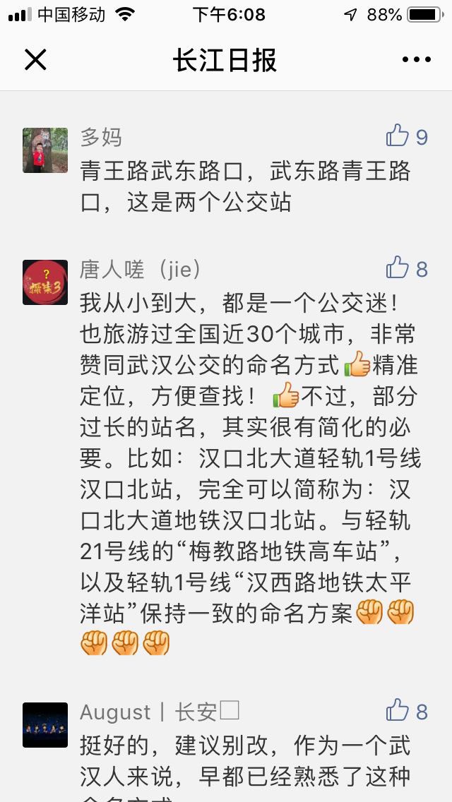 网友“冯贤桥”:武汉公交站名,真是要顾城市地理位置大局认真规范!越减化越好,更方便市民速记。